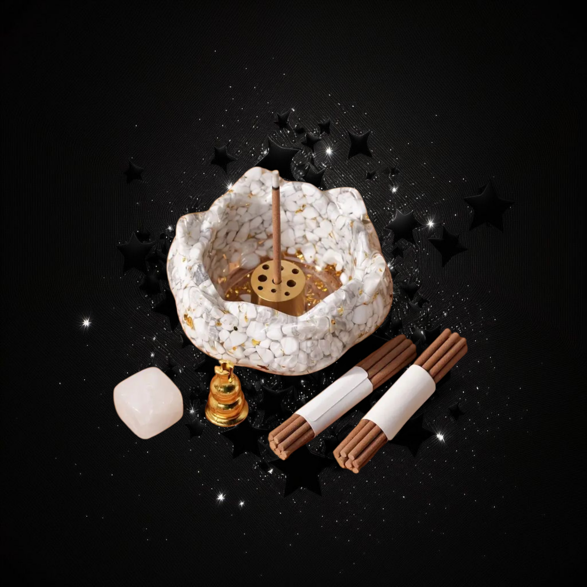 âA ritual activated energy amplifier howlite crystal incense bowl burner crystal bowl & incents are a powerful Energy Cleansing tool these Crystals absorb energies over time, and incense smoke is a traditional method for cleansing crystals and spaces of negative or stagnant energy, keeping the howlite's properties at their optimal level along with how it combines the calming and spiritually connective properties of the howlite crystal with the aromatic benefits of incense to create a serene, spiritually enriching environment. By integrating the act of burning incense with the inherent properties of howlite, a howlite crystal incense bowl burner becomes a powerful tool for holistic well-being, promoting tranquility, clarity, and spiritual growth.Â
